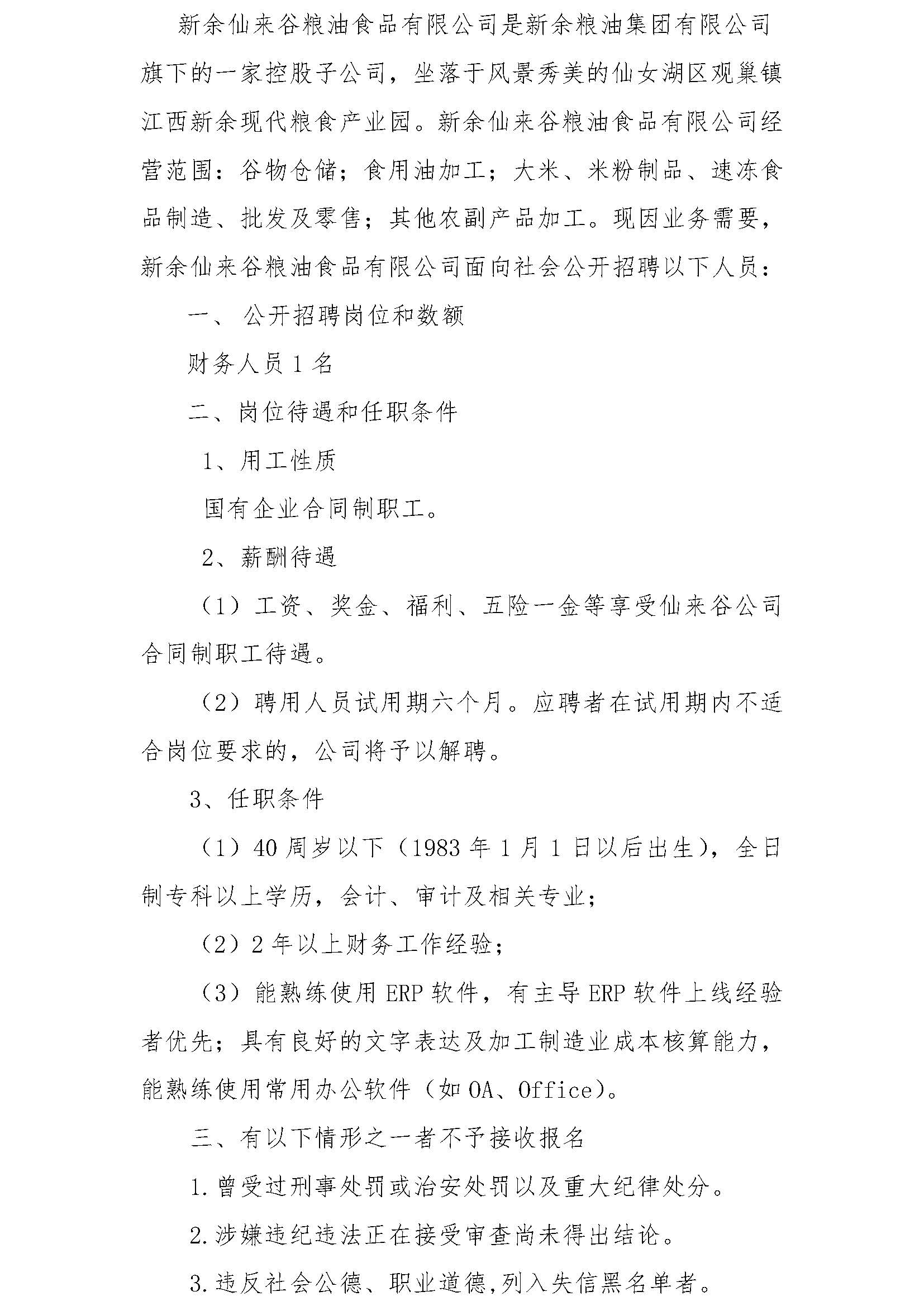 新余仙來(lái)谷糧油食品有限公司招聘財(cái)務(wù)人員的公告